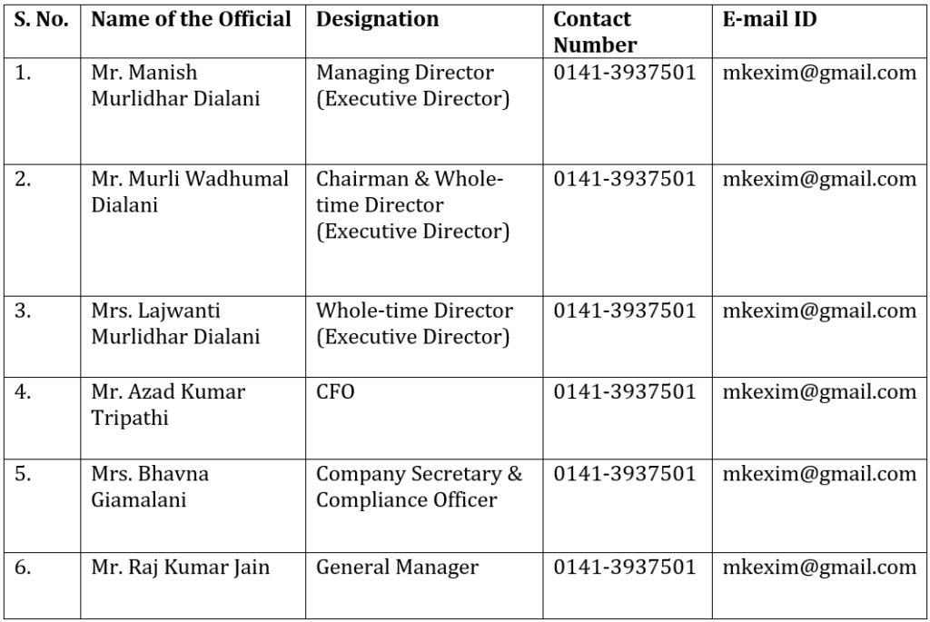 The following Key Managerial Personnel (KMPs) are hereby authorised for the purpose of determining materiality of an event or information and for the purpose of making disclosures to Stock Exchange(s) under Regulation 30(5) of the Listing Regulations. The contact details of the KMPs are as under: